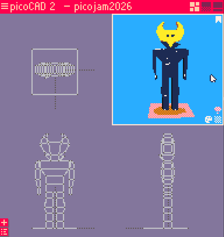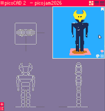 picoCAD2 jam submission featuring Wayne from Hylics 2. For the limitation: I didn't use camera rotation, I used animation by rotating the whole character on y axis.